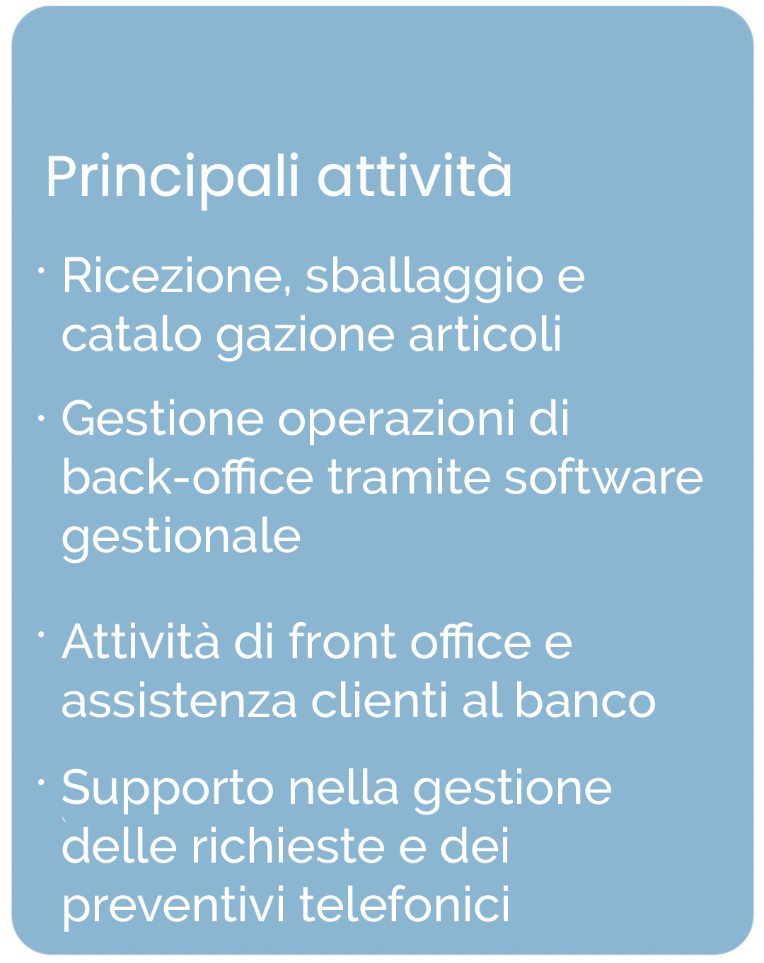 La figura affiancherà il Responsabile del Centro Ricambi nella gestione quotidiana del magazzino ricambi, occupandosi della ricezione, classificazione e organizzazione dei materiali, oltre al supporto al banco e nella gestione delle richieste dei clienti, sia in presenza che telefonicamente.