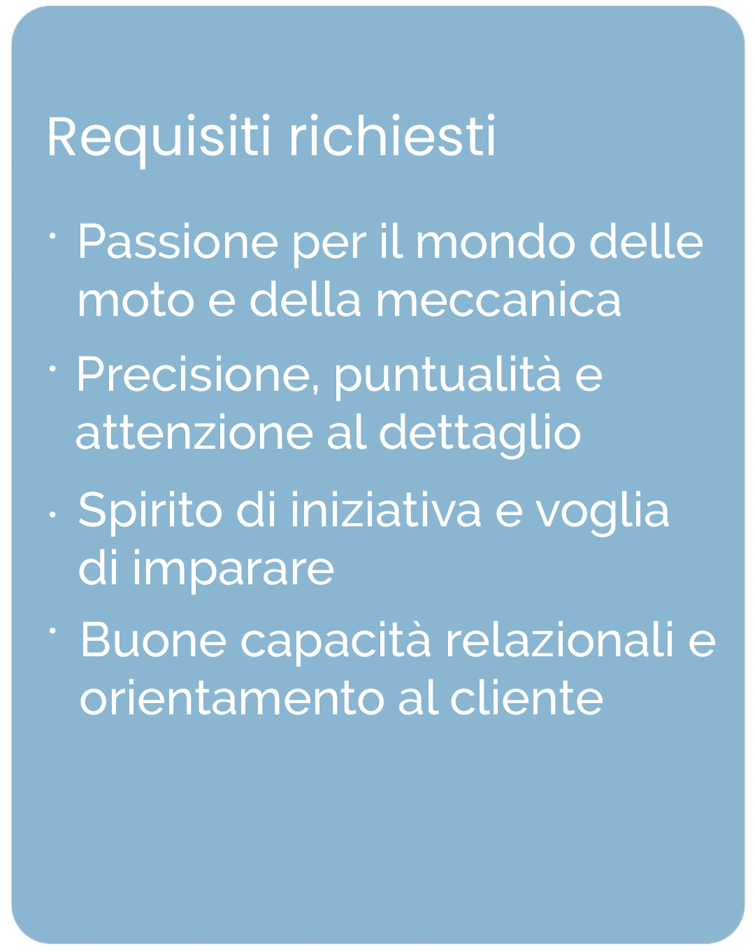Esperienze pregresse come impiegato in un Centro Ricambi, magazziniere in una Concessionaria o accettatore presso concessionarie moto o automotive saranno considerate un plus.